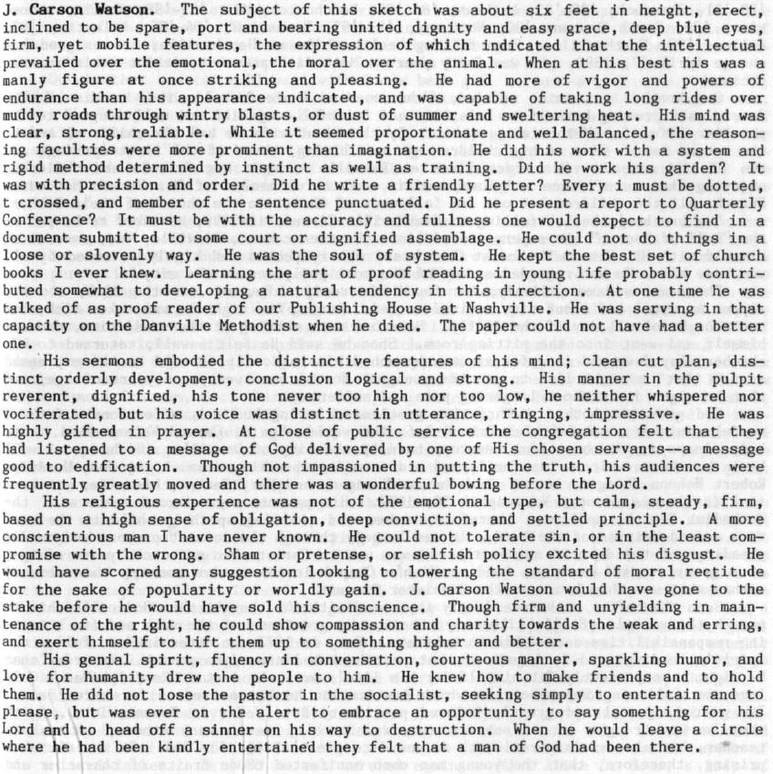 Reverend JAMES CARSON WATSON born Winchester, Va., Feb. 27, 1829; died Danville, Va., June 30, 1904; Methodist preacher, 1859-1904; first wife died in 1876 [unnamed] and he then married Hattie Jeter; died June 30, 1904; had several children.