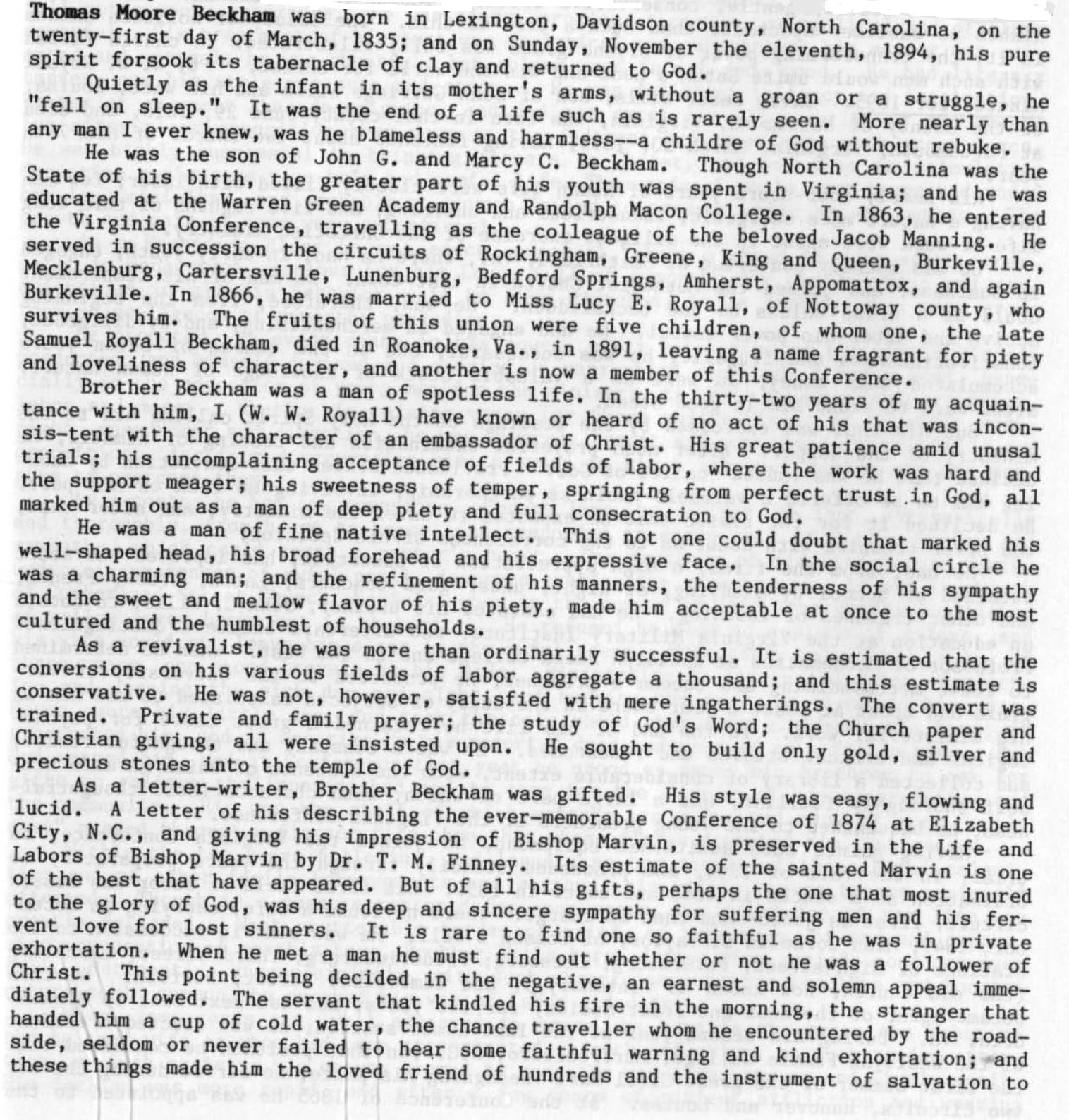 Thomas M. Beckham biography - Text Images from "Memoirs -- 200 Years" - Soldiers of the Cross, 1785-1987" by W.D. Keene, Jr.