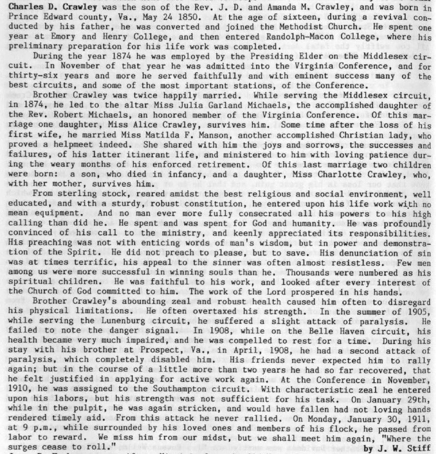 C. D. Crawley biography - Text Images from "Memoirs -- 200 Years" - Soldiers of the Cross, 1785-1987" by W.D. Keene, Jr.