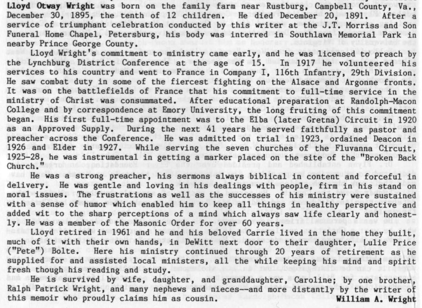 L. O. Wright biography - Text Images from "Memoirs -- 200 Years" - Soldiers of the Cross, 1785-1987" by W.D. Keene, Jr.